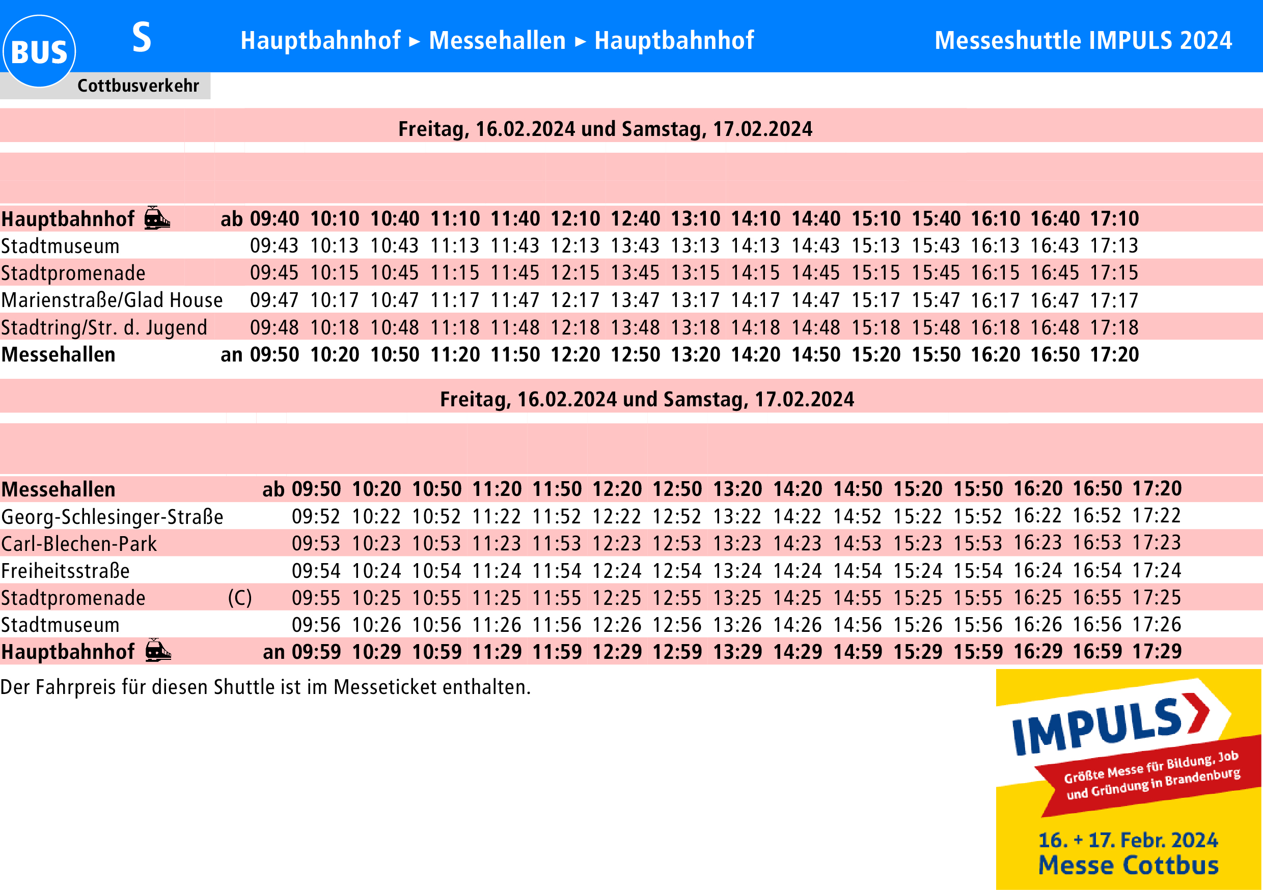 Sie wollen die IMPULS Messe besuchen und bequem ohne Parkplatzsuche und zusätzliche Gebühren anreisen? Kein Problem! Mit dem Kombiticket der CMT Cottbus GmbH und der Cottbusverkehr GmbH erreichen Sie die Messe ohne zusätzliche Kosten. Jede Eintrittskarte zur Messe gilt gleichzeitig als Fahrausweis für die An- und Abreise für den Shuttle-Service von Cottbusverkehr. An allen Messetagen ist ein Shuttlebus eingerichtet, der im 30-Minuten-Takt zwischen Hauptbahnhof über die Stadthalle zu den Messehallen verkehrt. Den Fahrplan finden Sie im Internet unter www.test.cottbusverkehr.de/aktuelles.